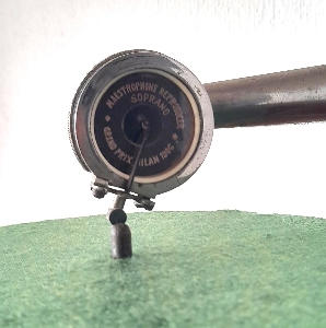 Petit gramophone de Paillard, Ste-Croix vers 1905-1910. L'état est très moyen mais le pavillon est peu courant et le décalque est super. Très proche du modèle Traviata. |